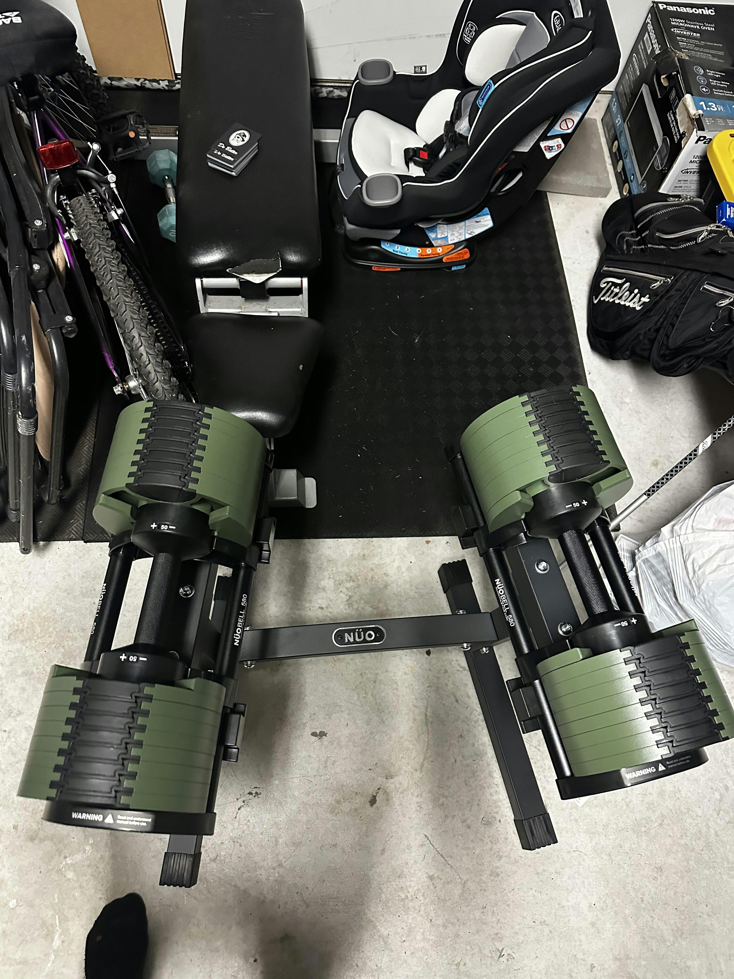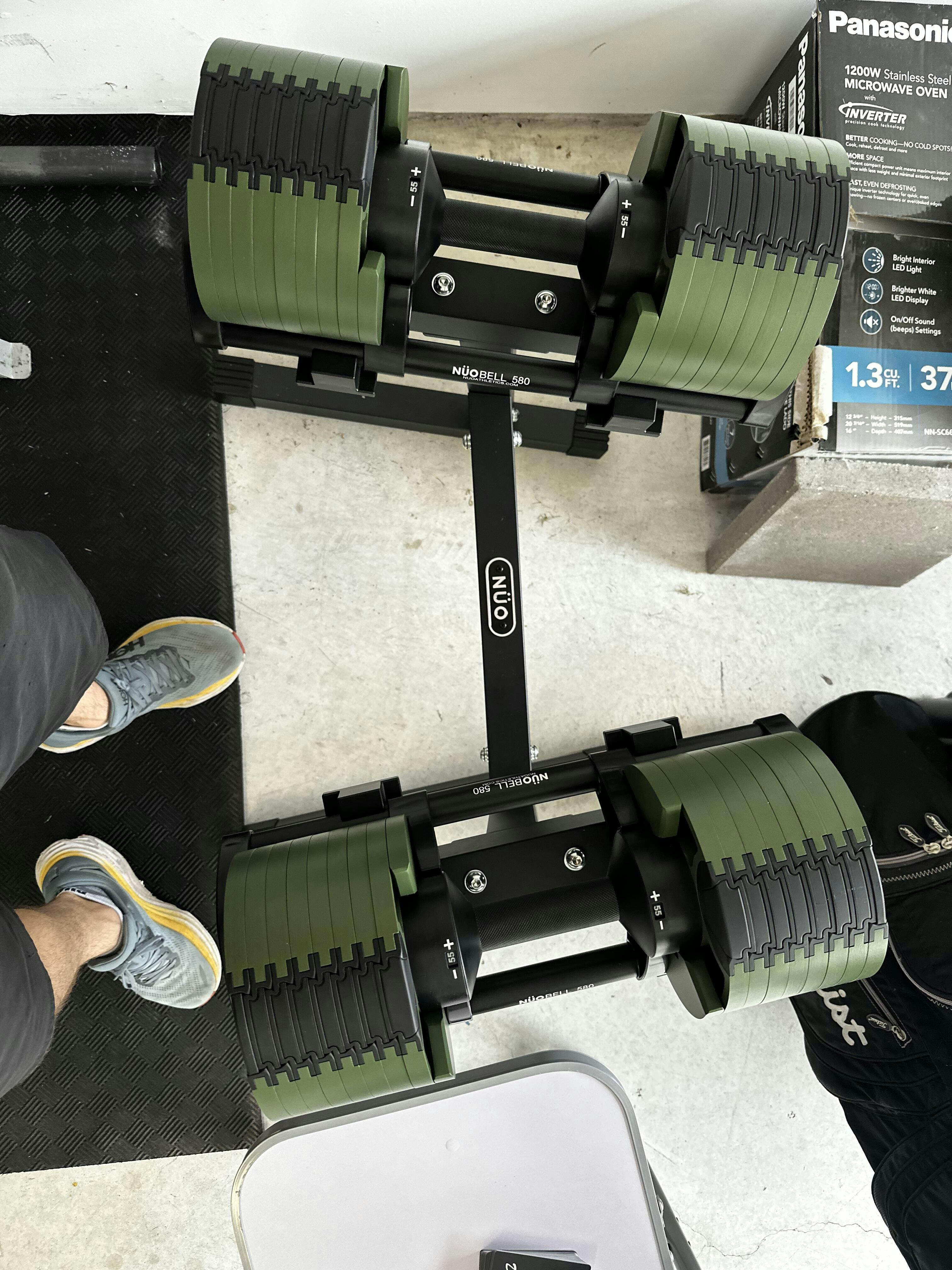 NÜOBELL 580 Green adjustable dumbbell in a vibrant green finish, offering versatile weight options and compact, efficient design for modern home gyms.